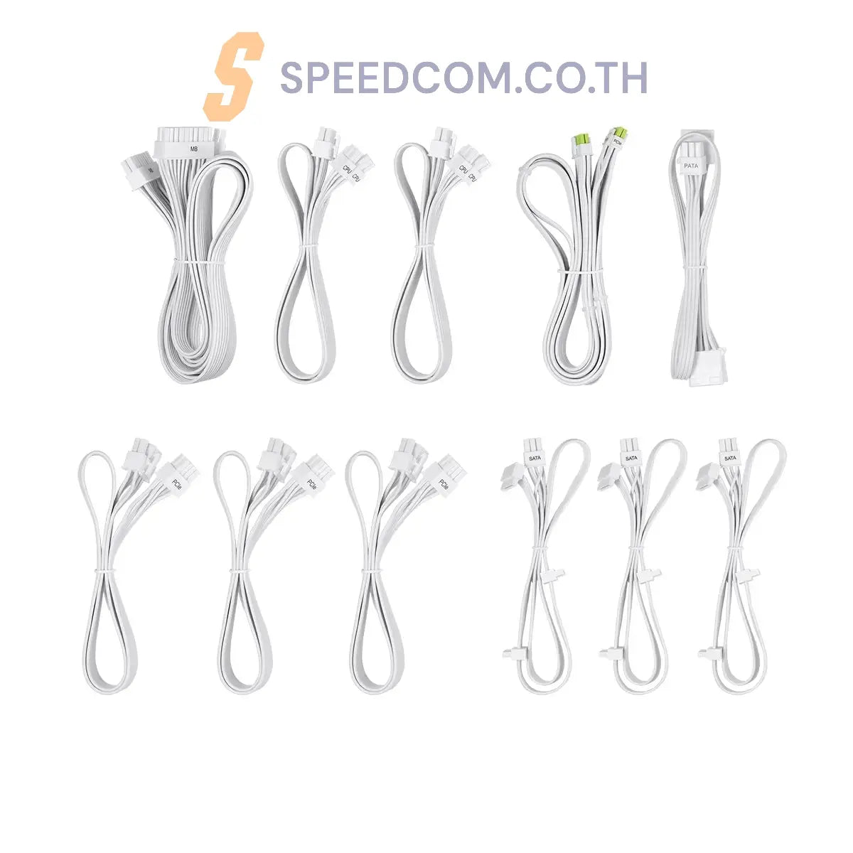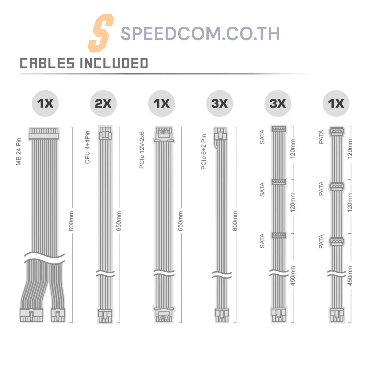 ช่องต่อ: x1 สายเคเบิลเมนบอร์ด (24 พิน), x2 ขั้วต่อ CPU EPS 12V (4+4 พิน), x1 ขั้วต่อ PCIe 5.1 (12+4 พิน) สองสี, x3 ขั้วต่อ PCIe (6+2 พิน), x3 ขั้วต่ออุปกรณ์ต่อพ่วง 4 พิน, x9 ขั้วต่อ SATA 5 พิน