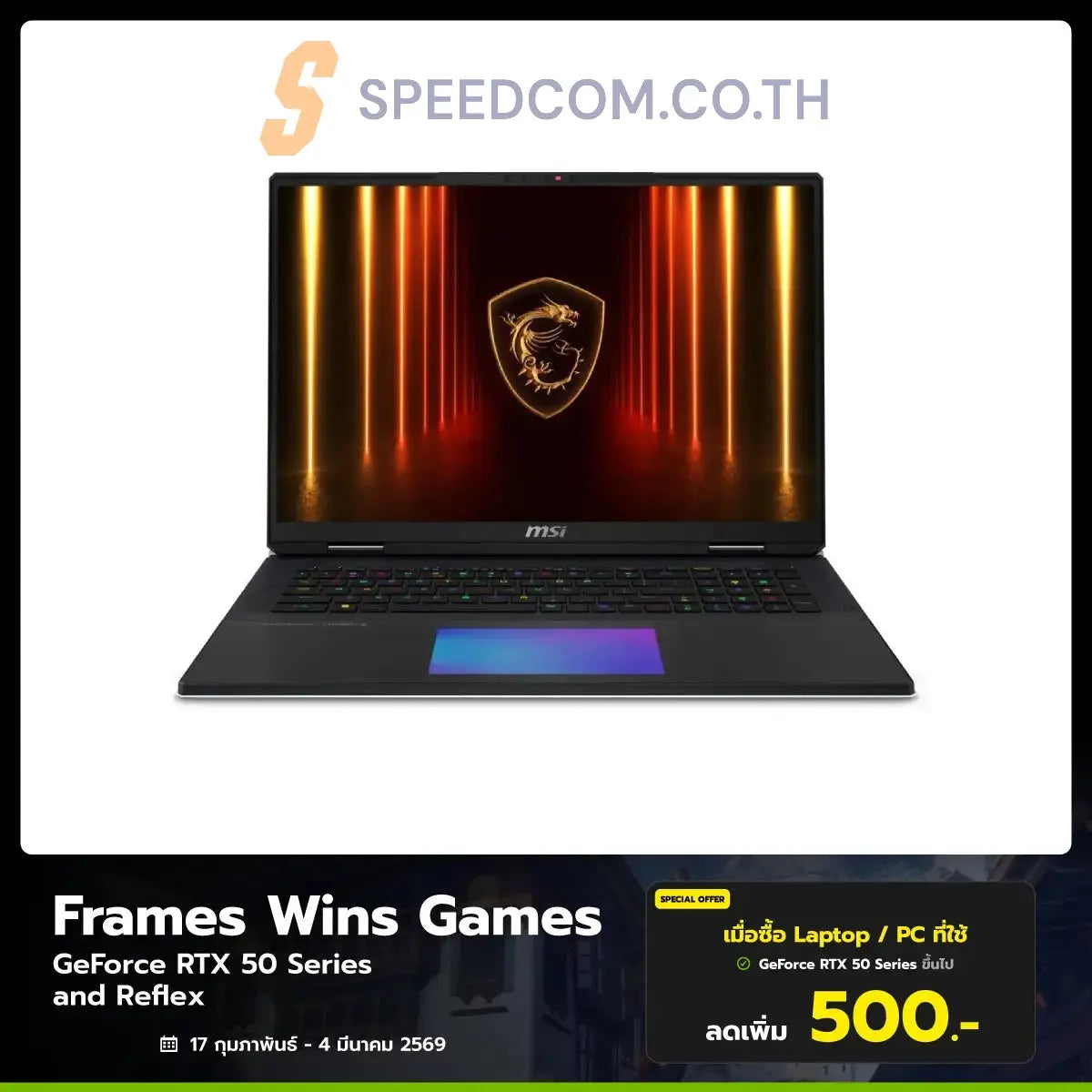 ขับเคลื่อนด้วย NVIDIA Blackwell, GPU สำหรับแล็ปท็อป GeForce RTX 50 Series มอบความสามารถที่เปลี่ยนเกมให้กับนักเล่นเกมและผู้สร้างคอนเทนต์ RTX 50 Series มาพร้อมกับพลัง AI ที่ทรงพลัง ช่วยให้ได้ประสบการณ์ใหม่และความแม่นยำของกราฟิกในระดับถัดไป เพิ่มประสิทธิภาพด้วย NVIDIA DLSS 4 สร้างภาพด้วยความเร็วที่ไม่เคยมีมาก่อน และปลดปล่อยความคิดสร้างสรรค์ของคุณด้วย NVIDIA Studio ทั้งหมดนี้รวมอยู่ในแล็ปท็อป RTX ที่บางที่สุดและใช้งานได้ยาวนานที่สุด ซึ่งได้รับการปรับให้เหมาะสมด้วย Max-Q