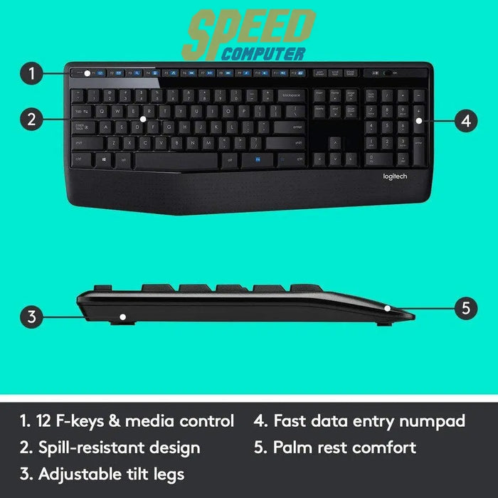 The keyboard features a spill-resistant design6 . Durable keys and sturdy tilt feet with adjustable height. 36-month keyboard battery life and 18-month mouse7 Battery - plus an on/off switch means you can go for months without the hassle of replacing batteries.