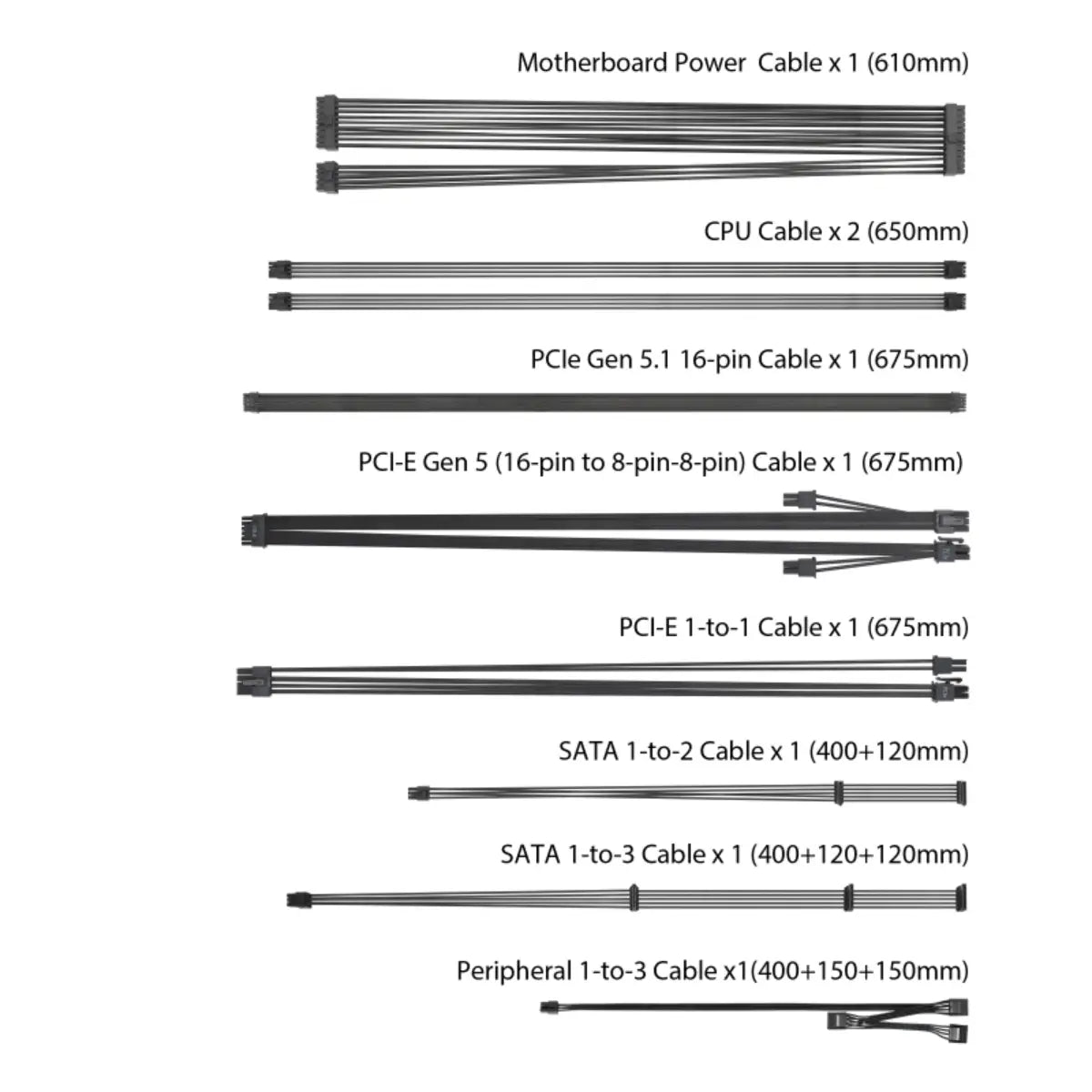 - Connections: MB 24/20-pin x 1, CPU 4+4-pin x 2, PCI-E 16-pin x 1 (both PSU & connector side), PCI-E 8-pin x 3, SATA x 5, PERIPHERAL x 3