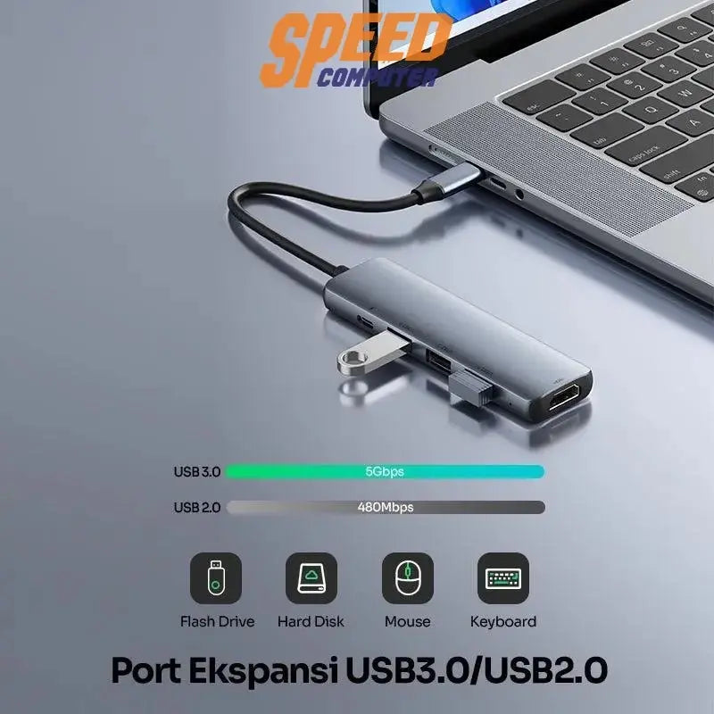 อะแดปเตอร์ฮับ 5-in-1 เชื่อมต่ออุปกรณ์ได้มากขึ้นเพื่อการทำงานที่มีประสิทธิภาพยิ่งขึ้น วัสดุโลหะผสมอลูมิเนียมที่มีคุณภาพดีและความทนทาน สามารถเชื่อมต่อแล็ปท็อป M-Books กับทีวีด้วยพอร์ต HDMI แล็ปท็อป USB-C ไปยังโปรเจคเตอร์หน้าจอ ใช้ชาร์จหรือชาร์จโน้ตบุ๊กได้ (พอร์ต PD) มีพอร์ต USB 3.0 จำนวน 1 พอร์ต สามารถใช้กับแล็ปท็อป M-Books และสมาร์ทโฟน Type-C